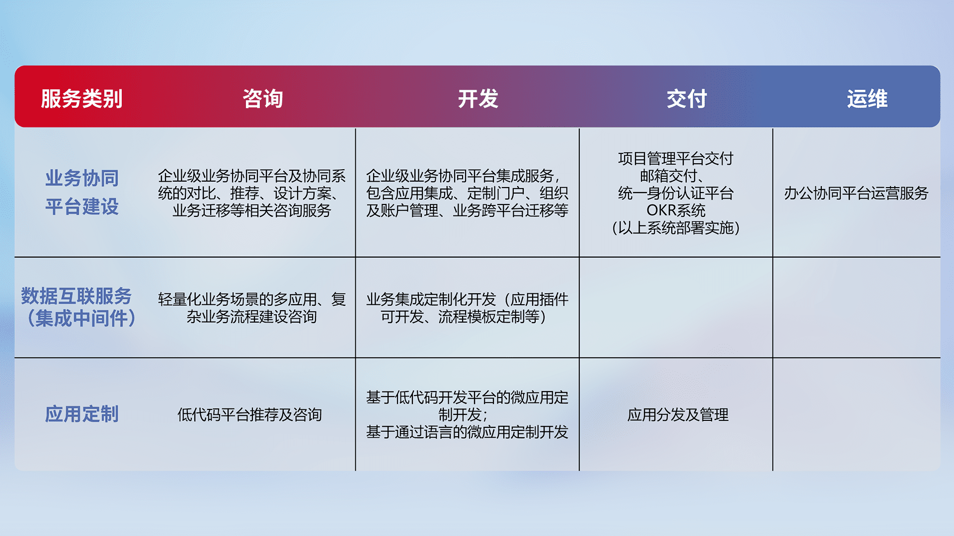 针对钉钉、、、企微、、IDaas等平台级产品提供产品的规划、、方案、、、交付、、定制化开发等服务,,,实现如统一协同办公、、智能客户服务、、、混合会议管理、、、、智能数据查询、、、等业务场景,,,实现数字化转型。。。。